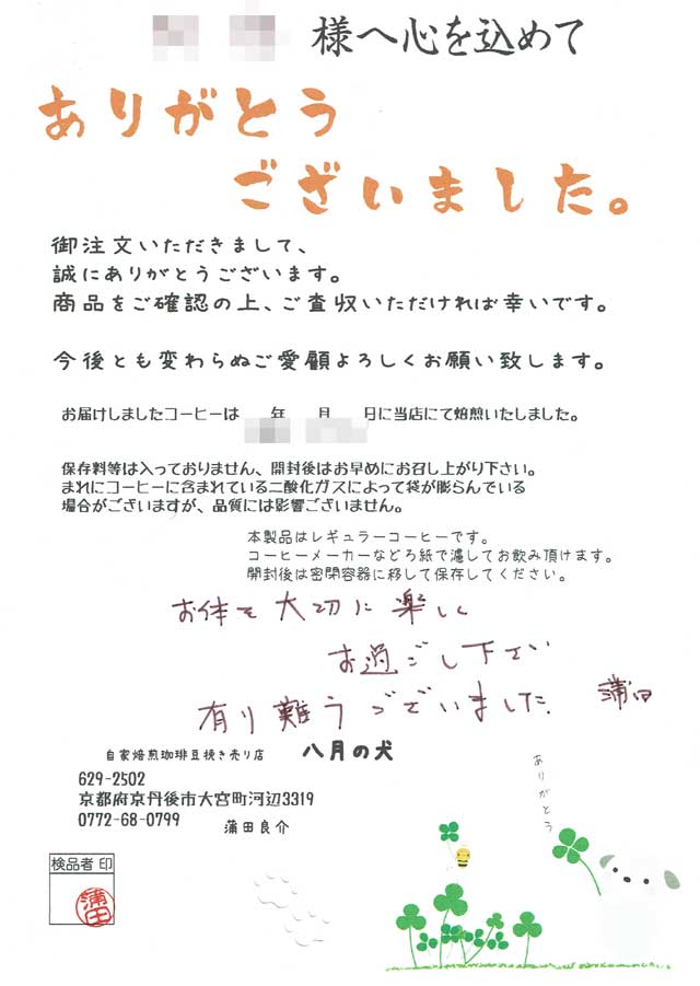 | 会社名 | 自家焙煎珈琲豆挽き売り八月の犬 |