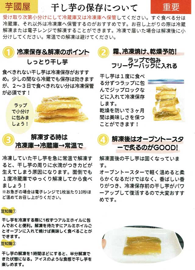 取り扱い商品は、干し芋、焼き芋、芋菓子・スイーツ、芋けんぴ、ギフト商品、セット商品・福袋など。